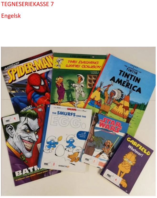 *Book her: Matematik spil  *Book her: Tegneseriekasse 7  *Book her: Emnekasse: De store fagbøger med forskellige titler  *Book her: Engelsk frilæsning - unge begyndere  *Book her: English Center - frilæsning udskoling  *Book her: Der Magische Würfel - 5 forskellige titler  *Book her: Engelsk kortspil til mellemtrin - udskoling  * Book her: Skumterninger med tal